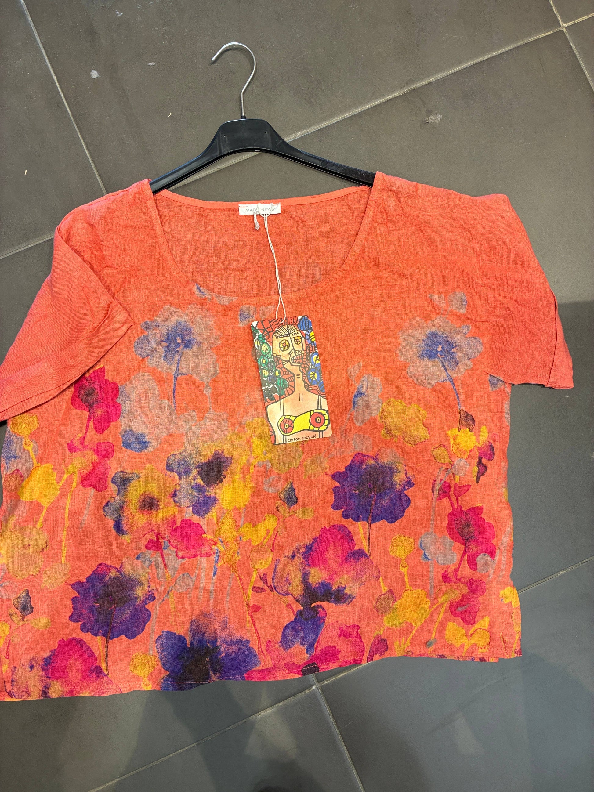 Round neck printed linen T-shirt 23310 100% LINEN: Tobacco